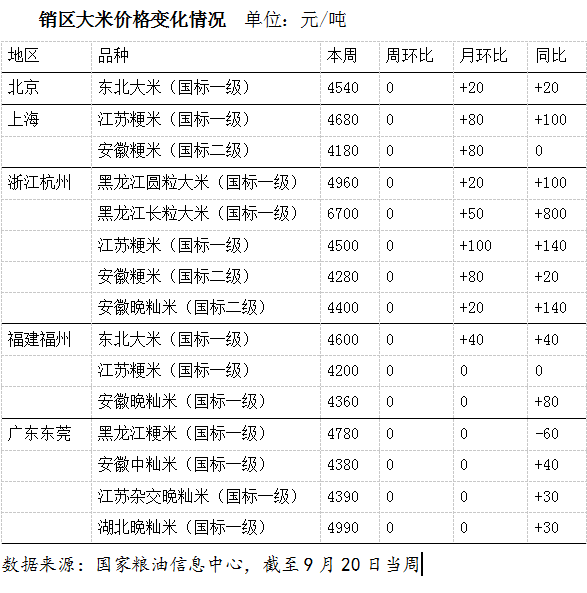 本周,人民币汇率小幅升值,叠加国际大米价格下跌,我国进口大米理论成本有所回落。9月20日,广东早籼米批发价4050元/吨;泰国5%破碎率大米理论到港完税价5028元/吨,价差-978元/吨;越南大米理论到港完税价5044元/吨,价差-994元/吨。